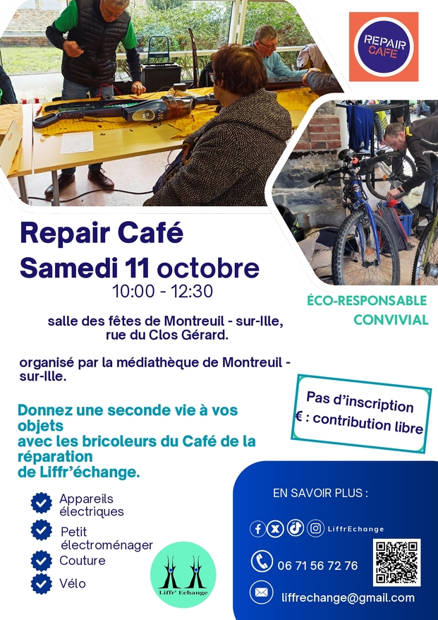Venez apprendre à réparer vos petits objets électriques, vêtements et vélos à la salle des fêtes de Montreuil sur Ille .
